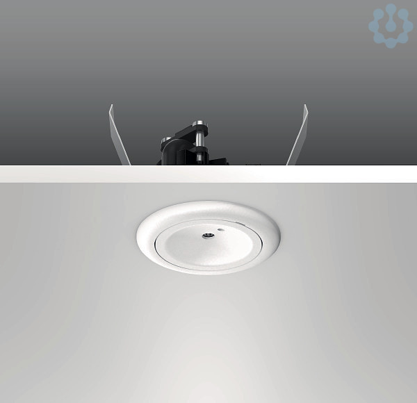 Minimalistische Deckeneinbauleuchte zur Rettungswegbeleuchtung. Gehäuse Aluminium-Druckguss als Kühlkörper ausgelegt. Abdeckring Kunststoff. Betriebsgerät und Akku in separater Gerätebox mit Verbindungsleitung. Einzelbatterie-Sicherheitsleuchte serienmäßig mit Prüftaster.