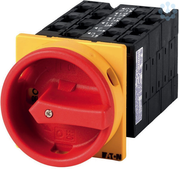 Sonderschalter, Sortiment: Sonderschalter, Typkenner: T3, STOPP-Funktion: NOT-AUS-Funktion, mit rotem Drehgriff und gelbem Sperrkranz, Hinweise: Kundenspezifische Ausführung gemäß Formblatt, Schutzart: Front IP65, Bauform: Einbau, Bemessungsbetriebsleistung AC-23A, 50 - 60 Hz 400 V: P = 15 kW, Bemessungsdauerstrom: Iu = 32 A, 6 Baueinheit(en), Normen und Bestimmungen: IEC/EN 60947, VDE 0660, IEC/EN 60204, Lasttrennschalter nach IEC/EN 60947-3