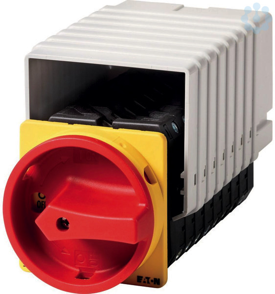 Sonderschalter, Sortiment: Sonderschalter, Typkenner: T5, STOPP-Funktion: NOT-AUS-Funktion, mit rotem Drehgriff und gelbem Sperrkranz, Hinweise: Kundenspezifische Ausführung gemäß Formblatt, Schutzart: Front IP65, Bauform: Einbau, Bemessungsbetriebsleistung AC-23A, 50 - 60 Hz 400 V: P = 55 kW, Bemessungsdauerstrom: Iu = 100 A, 8 Baueinheit(en), Normen und Bestimmungen: IEC/EN 60947, VDE 0660, IEC/EN 60204, Lasttrennschalter nach IEC/EN 60947-3