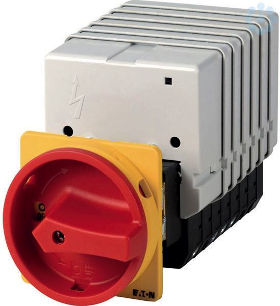 Sonderschalter, Sortiment: Sonderschalter, Typkenner: T5, STOPP-Funktion: NOT-AUS-Funktion, mit rotem Drehgriff und gelbem Sperrkranz, Hinweise: Kundenspezifische Ausführung gemäß Formblatt, Schutzart: Front IP65, Bauform: Zwischenbau, Bemessungsbetriebsleistung AC-23A, 50 - 60 Hz 400 V: P = 55 kW, Bemessungsdauerstrom: Iu = 100 A, 7 Baueinheit(en), Normen und Bestimmungen: IEC/EN 60947, VDE 0660, IEC/EN 60204, Lasttrennschalter nach IEC/EN 60947-3