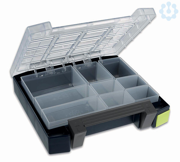 Die boxxser-Serie besteht aus 6 Koffervarianten in 2 unterschiedlichen Höhen, gefertigt aus stoßfestem und bruchsicherem Polycarbonat in einer Doppelwandkonstruktion, Profilraster in Deckel und Boden sichern den Kofferinhalt beim Transport, zwei feste Unterteilungen (neben dem Griff) bieten Raum für die Aufbewahrung von Kleinteilen oder Zubehör. Die integrierten Bodenprofilführungen schützen und sichern den Sortimentskoffer beim Stapeln. Griff mit integrierter Verriegelungssicherung verhindert das Öffnen des Koffers beim Tragen. inkl. 3 x Beschriftungsclips (rot, blau, gelb), 4 x 4 Fächerraster, mit 11 Einsätzen