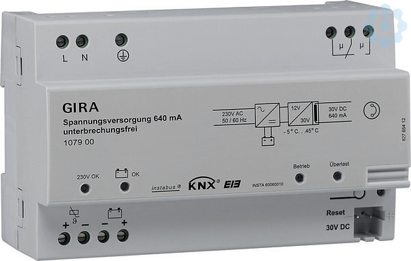 KNX Spannungsversorgung 640 mA unterbrechungsfreiREGSpannungsversorgungen zur Versorgung von KNX Geräten mit Busspannung.Merkmale: Ausgang mit integrierter Drossel zur Versorgung von KNX Buslinien. Ausgang DC 30 V zur Versorgung zusätzlicher Geräte. Nennstrom beliebig auf die Ausgänge aufteilbar. Reset-Taster. Kurzschlussfest. Überspannungsfest. Leerlaufsicher. Geeignet für Betrieb in Anlagen mit Notstromversorgung. Potenzialfreier Meldekontakt für Betriebs- und Diagnosemeldung. Die unterbrechungsfreie Spannungsversorgung 640 mA erzeugt die KNX Systemspannung. Mit integrierter Drossel zur Entkopplung der Buslinie von der Spannungsversorgung. Mit Anschlüssen für einen Bleigelakku zur Pufferung der KNX Spannung bei Netzausfall. Es können bis zu zwei Bleigelakkumulatoren angeschlossen und über die unterbrechungsfreie Spannungsversorgung geladen werden. Mit einem Temperaturfühler wird die Ladespannung temperaturabhängig geregelt. Die unterbrechungsfreie Spannungsversorgung besitzt einen potenzialfreien Wechselkontakt zum Melden einer Störung (z. B. Netzausfall, Akku-Fehler, Überlast bzw. Kurzschluss).Hinweise : Montage auf DIN-Hutschiene. VDE-Zulassung gemäß EN 60669-1, EN 60669-2-1. Der Anschluss erfolgt über KNX Busanschluss- bzw. Abzweigklemmen (keine Datenschiene erforderlich). Empfehlung: Überspannungsschutz für Gira KNX Produkte. Überspannungsableiter BUStector BT 24, Fabrikat: DEHN + SÖHNE, Artikel-Nr. 925001.