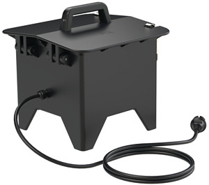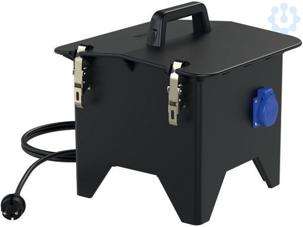 Mobiler Vollgummiverteiler Modell SPITZ IP54 320x320x320; 3m Kabel H07RN-F 2G1,5mm2 m.VG-Kont.-Stecker 16A 2p+PE 230V; 1xSK-Steckdose 16A 250V IP54 abgesichert d. Vorsich. Zuleit. nach Trenntrafo; 1xTrenntrafo 1.0kVA 230/230V prim. abges.ü. 1x therm. Schutzschalter 4.4A 1p; 1xÜbertemperatursicherung 70 Grad C manuelle Rückstellung; Verteiler anschlussfertig verdrahtet