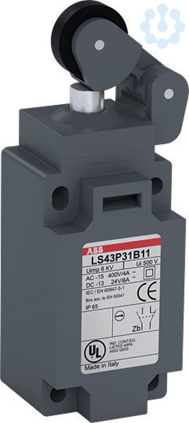 LS43P31B11 ist ein 40 mm breiter, standardmäßig verstärkter Positionsschalter aus glasfaserverstärktem UL-V0-Material in doppelter Isolierung, mit 4 Befestigungsbohrungen oben und unten, 1 Kabeleinführung nach ISO M20x1,5 unten, einem abgeflachten Rollenhebel mit Polyamid-Rolle und 1 Schließer + 1 Öffner als Sprungkontakt
