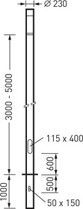 Standrohr des modularem, dekorativen LED-Lichtstelensystems CS 20. Mit durchgehend bitumiertem Erdstück. Revisionstür mit 3-Kant-Verschluss 10 mm, Gerätesteg mit C-Profil mit 2 x M6 Schiebemutter und M8 Erdungsschraube. Farbe anthrazit, ähnlich DB703 mit Metalleffekt, hochwetterfest, pulverbeschichtet. Standrohrlänge 5040 mm, Außendurchmesser Ø 230 mm. Schutzart (DIN EN 60529): IP44. Weitere Farben sowie Anti-Graffiti-Beschichtung auf Anfrage.