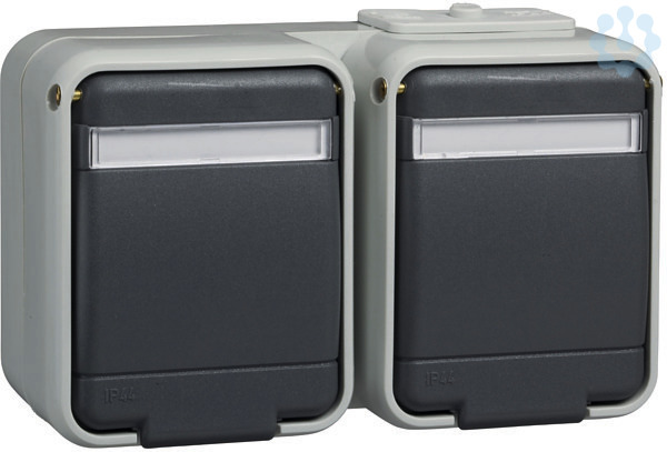 Steckdose mit Schriftfeld 2-fach waagerecht, 16 A 250V AC. Farbe: licht-/basaltgrau, vorverdrahtet, für Aufputzmontage. Schutzart IP 44, mit zwei Leitungseinführungen, Steckklemmen: Klemmbereich für Kupferleiter 1,5 mm und 2,5 mm, Verbindungsklemmen nach VDE 0620.
