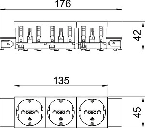 Schutzkontakt-Steckdose mit seitlichem Anschluss 3-fach 0°, mit erhöhtem Berührungsschutz, mit Steckklemmen, 2-polig, 16 A, 250 V~, mit Verbindungsklemmen nach IEC 60884-1, geeignet für den Einbau in Geräteeinbau-Kanalsysteme Rapid 45.