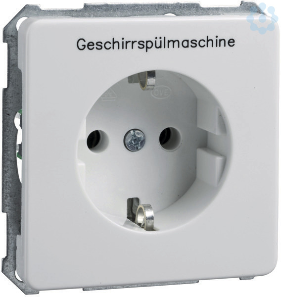Steckdoseneinsatz mit Beschriftung Geschirrspüler, Farbe: reinweiß Schutzkontakt-Steckdosen 16 A 250V AC Steckdosen mit Steckklemme sind mit Überspannungsschutzmodul als Gerätefeinschutz nachrüstbar. für Unterputzmontage, Schutzart IP 20 Steckklemmen Klemmbereich für Kupferleiter 1,5 mm² und 2,5 mm², Verbindungsklemmen nach VDE 0620.