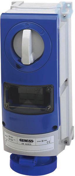 IEC Steckdose im Gehaeuse fuer senkrechte Anordnung mit Schalter und mechanischer Verriegelung. Der Schalter ist verriegelt und kann nur bei eingestecktem Stecker betaetigt werden. Durch ein Vorhaengeschloss kann die IEC Steckdose wahlweise im ein- oder ausgeschalteten Zustand gesichert werden. Zylindersicherungen mit der Groesse 10,3x38 mm fuer die Bemessungsstroeme 16 und 32 A und der Groesse 22x58 mm fuer 63 A.