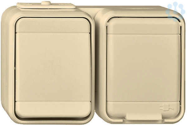 Universalschalter und Steckdose waagerecht. Farbe: perlweiß, Kombinationen Schalter 10 A 250V AC/ Schutzkontakt-Steckdose 16 A 250V AC, für Aufputzmontage. Schutzart IP 44, mit zwei Leitungseinführungen, Steckklemmen: Klemmbereich für Kupferleiter 1,5 mm und 2,5 mm, Verbindungsklemmen nach VDE 0620.