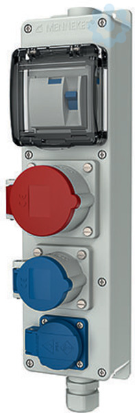 MENNEKES Steckdosen-Leiste anschlussfertig verdrahtet Schutzart IP 44 Gehaeuse: 1 PA-Gehaeuse 408x97x60 mm (LxBxH) elektrograu RAL 7035 Betaetigungsklappe auf Oberteil Bestueckung/Absicherung: Pos.01 1 CEE-Steckdose 16A 5p 400V Pos.02 1 CEE-Steckdose 16A 3p 230V Pos.03 1 SCHUKO-Steckdose 16A 2p+E 230V Pos.01-03 1 FI-Schutzschalter 40A 4p IFN=0,03A Leitungseinfuehrung/Anschlussmoeglichkeit: 1 M 25 verschlossen 1 M 25 mit Verschraubung (beigelegt) Klemme fuer 1 Leitung bis 5 x 2,5 mm² mit innenliegender Zugentlastung 1 Aufhaengebuegel (lose)
