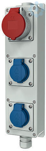 MENNEKES Steckdosen-Leiste anschlussfertig verdrahtet Schutzart IP 44 Gehaeuse: 1 PA-Gehaeuse 408x97x60 mm (LxBxH) elektrograu RAL 7035 Bestueckung: Pos.01 1 CEE-Steckdosen 16A 5p 400V Pos.02 2 SCHUKO-Steckdosen 16A 2p+E 230V Leitungseinfuehrung/Anschlussmoeglichkeit: 1 M 25 verschlossen 1 M 25 mit Verschraubung (beigelegt) Klemme fuer 1 Leitung bis 5 x 6 mm² mit innenliegender Zugentlastung 1 Aufhaengebuegel (lose)