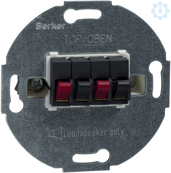 Stereo-Lautsprecher- Anschlussdose. Rückseitig mit Schraubanschluss. Leiterquerschnitt max. 10 mm2. Zur Komplementierung bitte Zentralplatte für Fernmeldeanschlussdose TAE verwenden. Mit Steckklemmen.