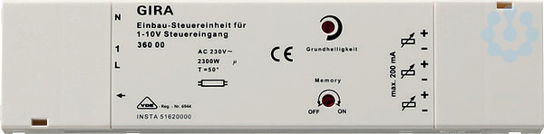 Steuereinheit 1 - 10 VWeißMerkmale: Einbau Steuereinheit zum Schalten und Dimmen von Leuchtstofflampen über EVG mit Steuereingang 1-10 V oder Gira Tronic-Trafos mit Steuereingang 1-10 V. Bedienung über mechanische Taster möglich. Lampenschonendes Einschalten. Memory-Funktion (Helligkeitsspeicher).
