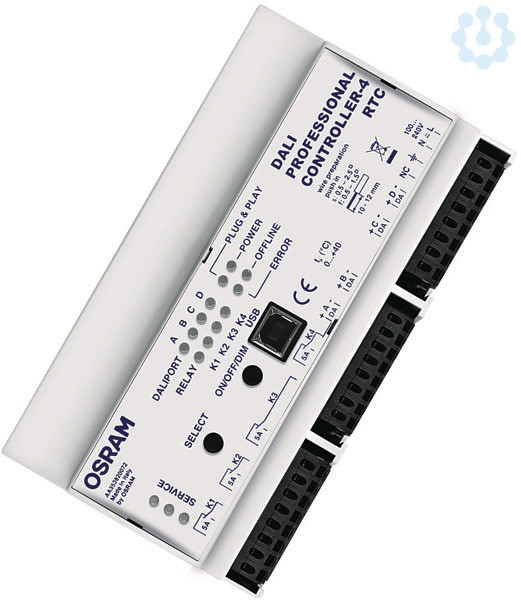Controllers for light management systems. Produkteigenschaften: Steuergerät für 4 DALI-Linien. Bis zu 50 Taster- / Sensorkoppler integrierbar. Integrierte DALI-Versorgung. 4 frei programmierbare Umschaltrelais; Lastkontakt: 4x 5 A. Tageslicht- und/oder präsenzabhängige oder manuelle Steuerung. Bis zu 4 x 16 Gruppen steuerbar. USB-PC-Anschluss. Interne Uhr zur Ereignissteuerung. Wochenschaltplan. Anschluss über schraublose Steckklemmen. Bedienung von Lichtszenen und -sequenzen (Wiederaufruf/Speicherung). 4 DALI-Linien. Corridor-Funktion mit voreingestelltem Licht-Programm. Gehäuse für Reiheneinbau. Leitungslänge der DALI-Steuerleitung: bis zu 300 m. Automatische oder manuelle Adressierung. Produktvorteile: Plug-and-Play-vorkonfiguriert für Einsatz ohne Inbetriebnahmeprozedur. Batteriepuffer bei Netzspannungsunterbrechung. Alle Leuchten des Systems können gedimmt bzw. geschaltet werden. Einfache Erstellung von Szenen, Sequenzen und Sequenzfolgen. Schalten und Dimmen von bis zu 256 DALI EVG. Sollwert für tageslichtabhängige Regelung über Doppelklick speicherbar. Sensorintegration in DALI. Anwendungsgebiete: Raumsteuerung, Stockwerkssteuerung, tageslichtabhängige Regelung. Anbindung von Licht- und Präsenzsensorik in DALI-Systeme. Konferenzräume. Büroräume: Einzel- und Gruppenarbeitsplätze. Fertigungs- und Montagehallen. Geeignet für Anwendungen im Innenbereich. Große Leuchtengruppen. Industrie. Flure. Lichtbänder. Logistikzentren. Klassenzimmer. Sporthallen. Schulungsräume. Technische Ausstattung: Geeignet für bis zu 256 elektronische Vorschaltgeräte mit DALI-Schnittstelle. Grafische Konfigurationssoftware mit Windows-Oberfläche.