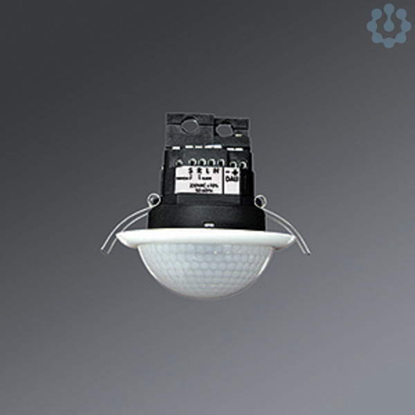 Sensor Licht/Präsenz für Deckeneinbau. Präsenzmelder, mit DALI-Schnittstelle, Integrierter Lichtsensor zur automatischen Konstantlichtregelung, Ansteuerung von bis zu 50 DALI Betriebsgeräte als Gruppe, Einstellungen manuell und durch Fernbedienung, beliebig viele Slavegeräte zur kostengünstigen Erweiterung des Erfassungsbereiches anschließbar, Zeiteinstellung 1-30min, Helligkeitswert 10-2000lx, für die Konstantlichtregelung darf die Montagehöhe 5m nicht überschreiten.