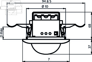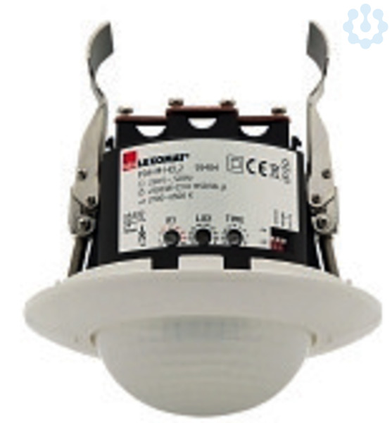 Sensor Licht/Präsenz/HCL für Deckeneinbau. Präsenzmelder für Deckeneinbau mit integriertem DALI-Controller für HCL, Ansteuerung von bis zu 50 DALI-DT8-Leuchten in max. 3 Funktionsgruppen, integrierte Echtzeituhr, voreingestellte und frei einstellbare HCL-Verlaufskurven, manuelle Bedienung über 3 konventionelle Taster möglich, Erweiterungen über Zubehör möglich, integriertes Schaltrelais, Parametrierung über BLE-IR-Adapter und Smartphone oder Tablet (Android, iOS), Erfassungsbereich kreisförmig 360°, Reichweite: max. Ø 24 m quer, max. Ø 8 m frontal, max. Ø 6,4 m sitzend, Montagehöhe min./max./empfohlen: 2 m / 10 m / 2,5 m