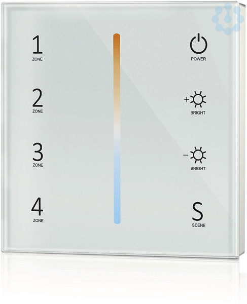 Steuergeräte mit Hochfrequenz-Technologie. Produkteigenschaften: Funk-Wandbedienpanel zur Ansteuerung von Tunable White LED Modulen. Ausgangssignal: 2.4 GHz. Eingangsspannung: 100…240 V. Produktvorteile: Ultraempfindliches, hochfestes Glas-Touchpanel mit Touch-Farbtemperaturschieber in der Mitte und Hintergrundbeleuchtung.. Steuerung von bis zu 4 Zonen. Dimmung der eingestellten Lichtfarbe. Einfaches ersetzen an dem Standard Lichtschalter. Anwendungsgebiete: Allgemeinbeleuchtung. Architekturbeleuchtung. Dynamische Effekte in Zonen mit Publikumsverkehr. Voutenbeleuchtung. Hotels. Büros. Wohnräume.