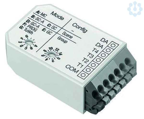 DALI-Eingangskontroller, 4 unabhängige Eingänge für potenzialfreie Kontakte, zur Anbindung handelsüblicher Taster oder Schalter, einstellbare Betriebsart und Wirkbereich über 2 Drehwahlschalter, mehrere DALI XC an der DALI-Linie möglich, Breite: 28,2 mm, Höhe: 47,7 mm, Tiefe: 14,6 mm, Betriebsspannung: DALI-Bus.