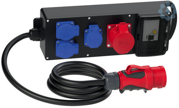 Mobiler Vollgummiverteiler Modell STEYREGG IP54 430x79x129; 2m Kabel H07RN-F 5G2,5mm2 schwarz mit Stecker 16A 5p 400V; 1xCEE-Steckdose 16A 5p 400V abgesichert d. Vorsicherung Zuleitung; 3xSK-Steckdose 16A 250V IP54 abgesichert d. Vorsicherung Zuleitung; 1xFI 40A/4/0.03A (TYP A 25AT) über alle Ausgänge; FI Fabrikat Eaton ÖVE / VDE; Verteiler betriebsfertig angeschlossen
