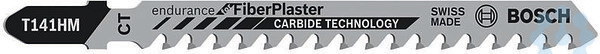 Das T 141 HM Special for Fibre and Plaster Stichsägeblatt ist besonders robust bei geraden Schnitten in dicken und dünnen Sonderwerkstoffen. Die geschliffenen, geschränkten Carbide-Zähne sind für eine lange Lebensdauer beim Schneiden von hochabrasiven Materialien auf Mineralbasis konzipiert. Die Zahnleiste ist zudem mit der Carbide Technology an einen hochelastischen Kohlenstoffstahlkörper geschweißt, wodurch das Blatt durch die robustesten abrasiven Materialien, wie z. B. Zementfaserplatten, Gipskartonplatten, Porenbeton und glasfaserverstärkten Kunststoff, schneiden kann. Es besitzt einer großen Zahnteilung (4,3 mm) und eine Länge von 100 mm, um Faser- und Gipsmaterialien mit einer Dicke von 5-50 mm zu schneiden.