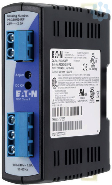 Stromversorgungsgerät, Sortiment: Stromversorgungen PSG, Untersortiment: Stromversorgungsgerät, Beschreibung: Power Boost durch 1,5-fachen Nennstrom für 5 s, PELV (EN 60204), SELV (EN 60950), Breite: 32 mm, Höhe: 120.6 mm, Tiefe: 119.3 mm, 1-phasig, Eingangsspannungsbereich: 85 - 264 V AC, (120 - 375 V DC), Bemessungseingangsspannung: 100 - 240 V AC, Bemessungsausgangsspannung: 24 V DC (± 2%), Bemessungsausgangsstrom: 2.5 A, Einstellbereich der Ausgangsspannung: 22 - 28 V DC, Nennausgangsleistung: 60 W, Schutzart: IP20, Verlustleistung: 9 W
