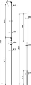 Stützrohr GFK/NIRO mit innenliegendem Endverschluss und PA-Federelement für die HVI long Leitung, zum getrennten (isolierten) Aufbau von Fangeinrichtungen mit Fangstange. Zum Einhalten des Trennungsabstandes zu elektrisch leitenden Teilen nach DIN EN 62305-3 (VDE 0185-305-3). Rohr D50 mm aus glasfaserverstärktem Kunststoff (GFK), UV-stabilisiert, Farbe lichtgrau, Materialfaktor km= 0,7. Ausführung einteilig, kombiniert mit Fangstange (D22 / 16 / 10 mm, Länge 2500 mm) aus NIRO.