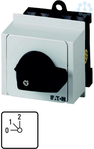 Stufenschalter, Sortiment: Steuerschalter, Normen und Bestimmungen: IEC/EN 60947, VDE 0660, IEC/EN 60204, CSA, UL, Lasttrennschalter nach IEC/EN 60947-3, Typkenner: T0, mit schwarzem Knebel und Frontschild, Kontakte: 4, Schutzart: Front IP30, Bauform: Verteilereinbau, Schaltwinkel: 45 °, Schaltverhalten: rastend, mit 0-Stellung, 2 Baueinheit(en), Bemessungsdauerstrom: Iu= 20 A, Frontschild: 0-2