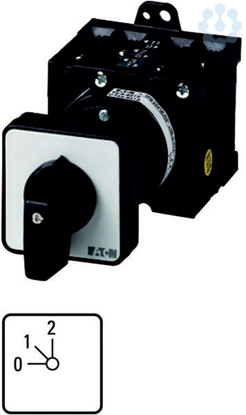 Stufenschalter, Sortiment: Steuerschalter, Normen und Bestimmungen: IEC/EN 60947, VDE 0660, IEC/EN 60204, CSA, UL, Lasttrennschalter nach IEC/EN 60947-3, Typkenner: T0, mit schwarzem Knebel und Frontschild, Kontakte: 2, Kontaktverhalten: unterbrechungslos, Schutzart: Front IP65, Bauform: Zwischenbau, Schaltwinkel: 45 °, Schaltverhalten: rastend, mit 0-Stellung, 1 Baueinheit(en), Bemessungsdauerstrom: Iu= 20 A, Frontschild: 0-2