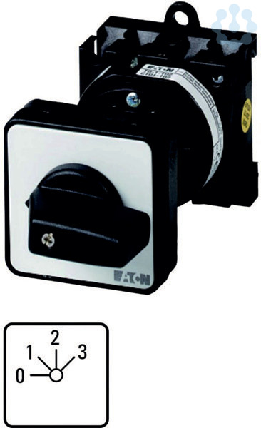 Stufenschalter, Sortiment: Steuerschalter, Normen und Bestimmungen: IEC/EN 60947, VDE 0660, IEC/EN 60204, CSA, UL, Lasttrennschalter nach IEC/EN 60947-3, Typkenner: T0, mit schwarzem Knebel und Frontschild, Kontakte: 3, Stufenanzahl: 3 Stufen 45°, Schutzart: Front IP65, Bauform: Zwischenbau, Schaltwinkel: 45 °, Schaltverhalten: rastend, mit 0-Stellung, 2 Baueinheit(en), Bemessungsdauerstrom: Iu= 20 A, Frontschild: 0-3