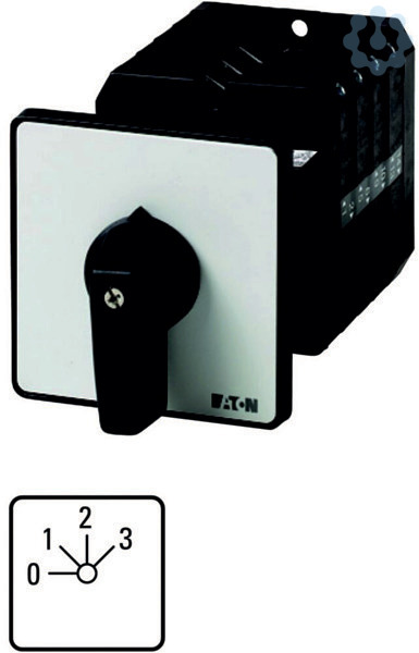 Stufenschalter, Sortiment: Steuerschalter, Typkenner: T5, mit schwarzem Knebel und Frontschild, Kontakte: 6, Schutzart: Front IP65, Bauform: Zwischenbau, Schaltwinkel: 45 °, Schaltverhalten: rastend, mit 0-Stellung, Frontschild: 0-3, Bemessungsbetriebsleistung AC-23A, 50 - 60 Hz 400 V: P = 55 kW, Bemessungsdauerstrom: Iu = 100 A, 3 Baueinheit(en), Normen und Bestimmungen: IEC/EN 60947, VDE 0660, IEC/EN 60204, Lasttrennschalter nach IEC/EN 60947-3