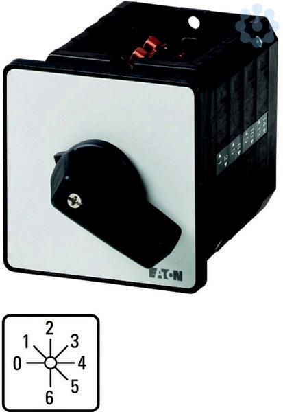 Stufenschalter, Sortiment: Steuerschalter, Normen und Bestimmungen: IEC/EN 60947, VDE 0660, IEC/EN 60204, CSA, UL, Lasttrennschalter nach IEC/EN 60947-3, Typkenner: T5B, mit schwarzem Knebel und Frontschild, Kontakte: 6, Schutzart: Front IP65, Bauform: Einbau, Schaltwinkel: 45 °, Schaltverhalten: rastend, mit 0-Stellung, 4 Baueinheit(en), Bemessungsdauerstrom: Iu= 63 A, Frontschild: 0-6