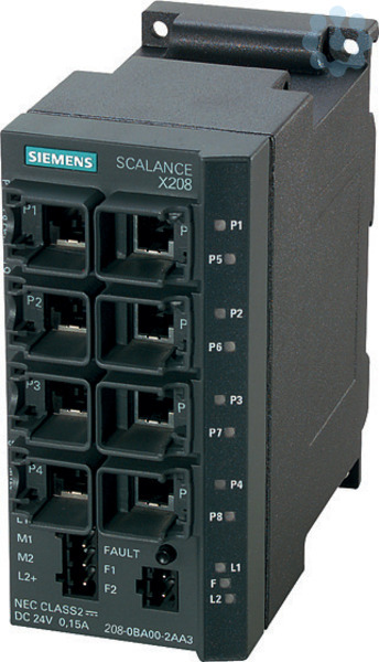 SCALANCE X208, managed IE Switch, 8x 10/100 Mbit/s RJ45 Ports, LED-Diagnose, Fehlermelde- Kontakt mit Set-Taster, redundante Spannungsversorgung, PROFINET IO Device, Netzwerk-Management, Redundanz-Manager integriert, inkl. elektron. Handbuch auf CD-ROM, C-PLUG optional. SCALANCE X208 Managed, Layer 2 Kompakt Switch, 8x 10/100 Mbit/s RJ45 für Industrial Ethernet/PROFINET-NetzwerkeRobustes Metallgehäuse in S7-300-Format für den platzsparenden Schaltschrankeinbau. Integration in eine Automatisierungslösung mit S7-300-Komponenten.Hohe Netzverfügbarkeit durch Aufbau redundanter Ringstrukturen mit schneller Medienredundanz (integrierter Redundanzmanager). Optimale Einbindung in die Prozess- und Systemdiagnose mit PROFINET und Integration in bestehende Netzwerkmanagement-Systemedurch standardisierten SNMP-Zugang. Zuverlässige Steckverbindungen über robusten, industriegerechten Geräteanschluss in Verbindung mit PROFINET-konformen FastConnect-Steckern sowie Möglichkeit des Gerätetausches mittels des C-PLUGs. Integrierte Projektierung und Diagnose in das Engineering Tool STEP 7 und Diagnose am Gerät über LED.Managed, Layer 2 Kompakt Switch, DC 24 V, 8x 10/100 Mbit/s RJ45 Ports elektrisch, PN IO Device.Umfangreiches Zubehör wie z.B. das Wechselmedium C-PLUG, SITOP PSU100C 24 V/0,6 Azur geregelten Stromversorgung, Klemmblock für Meldekontakt, RJ45 Steckverbinder, Koffer zur Selbstkonfektionierung von FO-Leitungen (ST/BFOC), Montagewinkel zur Befestigung auf S7-1500 Profilschiene, Abisolierwerkzeug und verschiedene Leitungsvarianten (auch vorkonfektioniert) rundet das System ab.