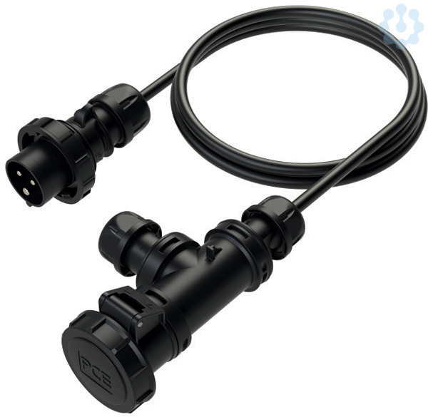 CEE Stecker 16A 3p +Kabel mit Kupplung und Kabelauslass IP67 (T-Connect) schwarz; Gehäusematerial: PC/ABS; Nennstrom: 16A; Polzahl: 3 (2P+PE); Uhrzeit-Stellung: 6h; Nennspannung/Frequenz: 200-250V~ / 50+60Hz; Kontakte: Messing; Eingang: 1,5m Kabel (H07RN-F 3G1,5) mit Stecker 16A 3p 6h; Ausgang: 1x CEE-Dose 16A 3p 6h, 1x Kabelauslass mit Zugentlastung, , Klemmleiste 3x2,5mm²; fertig verdrahtet; Farbe: schwarz; Schutzart: IP67