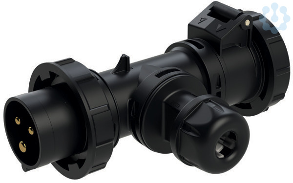 CEE Stecker 16A 3p mit Kupplung und Kabelauslass IP67 (T-Connect) schwarz; Gehäusematerial: PC/ABS; Nennstrom: 16A; Polzahl: 3 (2P+PE); Uhrzeit-Stellung: 6h; Nennspannung/Frequenz: 200-250V~ / 50+60Hz; Kontakte: Messing; Eingang: 1x CEE-Stecker 16A 3p 6h; Ausgang: 1x CEE-Dose 16A 3p 6h, 1x Kabelauslass mit Zugentlastung, , Klemmleiste 3x2,5mm²; fertig verdrahtet auf Klemmleiste; Farbe: schwarz; Schutzart: IP67