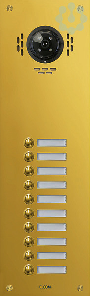 TMG-10/1 Aussenstation für Kamera-Türlautsp. 10/1 Rund-Taster UP PVD-mess. ESTA. Unterputz Video-Türstation für Sprechanlage/Intercom nach DIN EN 50486. Bestehend aus einer 2 mm dicken Frontplatte aus Edelstahl, poliert und veredelt mit witterungsbeständiger PVD-Messing-Beschichtung, mit Lochsprechöffnungen, runder Klingeltaster, Spezialschrauben, Namensschild (von vorn wechselbar) mit LED-Beleuchtung, Video-Vorbereitung und UP-Gehäuse 55 mm Tiefe. Hinweis: Passende Elektronik und Lautsprecher erforderlich.