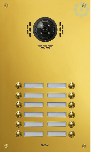 TMG-12/2 Aussenstation für Kamera-Türlautsp. 12/2 Rund-Taster UP PVD-mess. ESTA. Unterputz Video-Türstation für Sprechanlage/Intercom nach DIN EN 50486. Bestehend aus einer 2 mm dicken Frontplatte aus Edelstahl, poliert und veredelt mit witterungsbeständiger PVD-Messing-Beschichtung, mit Lochsprechöffnungen, runder Klingeltaster, Spezialschrauben, Namensschild (von vorn wechselbar) mit LED-Beleuchtung, Video-Vorbereitung und UP-Gehäuse 55 mm Tiefe. Hinweis: Passende Elektronik und Lautsprecher erforderlich.