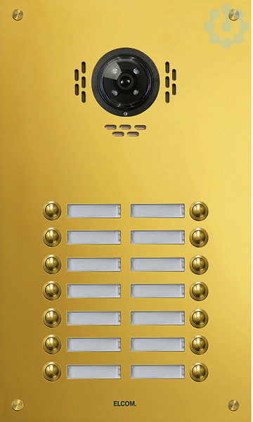 TMG-14/2 Aussenstation für Kamera-Türlautsp. 14/2 Rund-Taster UP PVD-mess. ESTA. Unterputz Video-Türstation für Sprechanlage/Intercom nach DIN EN 50486. Bestehend aus einer 2 mm dicken Frontplatte aus Edelstahl, poliert und veredelt mit witterungsbeständiger PVD-Messing-Beschichtung, mit Lochsprechöffnungen, runder Klingeltaster, Spezialschrauben, Namensschild (von vorn wechselbar) mit LED-Beleuchtung, Video-Vorbereitung und UP-Gehäuse 55 mm Tiefe. Hinweis: Passende Elektronik und Lautsprecher erforderlich.