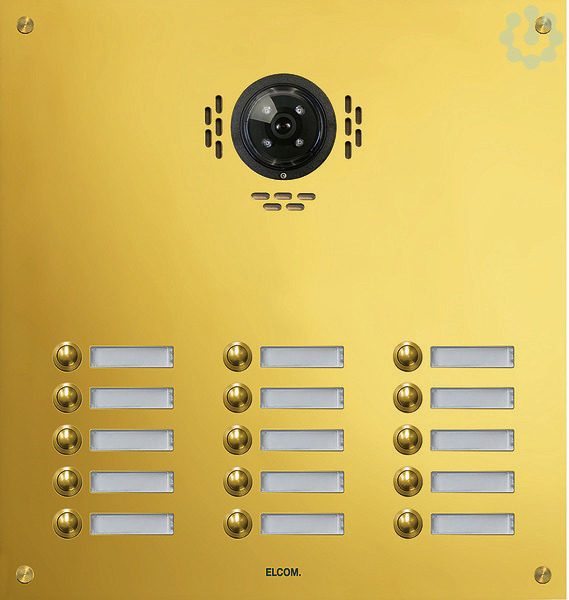 TMG-15/3 Aussenstation für Kamera-Türlautsp. 15/3 Rund-Taster UP PVD-mess. ESTA. Unterputz Video-Türstation für Sprechanlage/Intercom nach DIN EN 50486. Bestehend aus einer 2 mm dicken Frontplatte aus Edelstahl, poliert und veredelt mit witterungsbeständiger PVD-Messing-Beschichtung, mit Lochsprechöffnungen, runder Klingeltaster, Spezialschrauben, Namensschild (von vorn wechselbar) mit LED-Beleuchtung, Video-Vorbereitung und UP-Gehäuse 55 mm Tiefe. Hinweis: Passende Elektronik und Lautsprecher erforderlich.