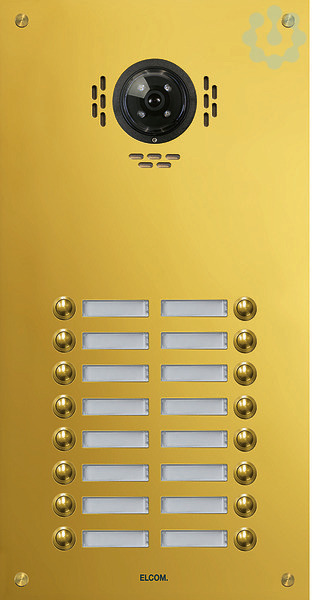 TMG-16/2 Aussenstation für Kamera-Türlautsp. 16/2 Rund-Taster UP PVD-mess. ESTA. Unterputz Video-Türstation für Sprechanlage/Intercom nach DIN EN 50486. Bestehend aus einer 2 mm dicken Frontplatte aus Edelstahl, poliert und veredelt mit witterungsbeständiger PVD-Messing-Beschichtung, mit Lochsprechöffnungen, runder Klingeltaster, Spezialschrauben, Namensschild (von vorn wechselbar) mit LED-Beleuchtung, Video-Vorbereitung und UP-Gehäuse 55 mm Tiefe. Hinweis: Passende Elektronik und Lautsprecher erforderlich.