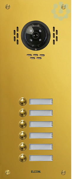 TMG-6/1 Aussenstat. für Kamera-Türlautsprecher 6/1 Rund-Taster UP PVD-mess. ESTA. Unterputz Video-Türstation für Sprechanlage/Intercom nach DIN EN 50486. Bestehend aus einer 2 mm dicken Frontplatte aus Edelstahl, poliert und veredelt mit witterungsbeständiger PVD-Messing-Beschichtung, mit Lochsprechöffnungen, runder Klingeltaster, Spezialschrauben, Namensschild (von vorn wechselbar) mit LED-Beleuchtung, Video-Vorbereitung und UP-Gehäuse 55 mm Tiefe. Hinweis: Passende Elektronik und Lautsprecher erforderlich.