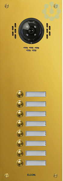 TMG-8/1 Aussenstat. für Kamera-Türlautsprecher 8/1 Rund-Taster UP PVD-mess. ESTA. Unterputz Video-Türstation für Sprechanlage/Intercom nach DIN EN 50486. Bestehend aus einer 2 mm dicken Frontplatte aus Edelstahl, poliert und veredelt mit witterungsbeständiger PVD-Messing-Beschichtung, mit Lochsprechöffnungen, runder Klingeltaster, Spezialschrauben, Namensschild (von vorn wechselbar) mit LED-Beleuchtung, Video-Vorbereitung und UP-Gehäuse 55 mm Tiefe. Hinweis: Passende Elektronik und Lautsprecher erforderlich.