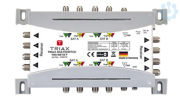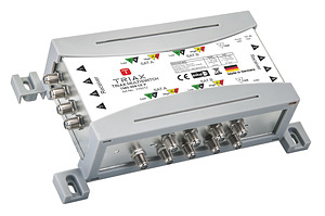 Die TRIAX TMS 9xx CE P sind kaskadierbare SAT-ZF-Multischalter für bis zu 2 SAT-Positionen + Terrestrik. Die Schalter gibt es in verschiedenen Ausführungen mit 8 bis 32 Teilnehmeranschlüssen und passiver Terrestrik. Gespeist werden sie über ein externes Netzteil (TMS 1520-55 PSU, 15 V, 2 A) oder über einen aktiven Multischalter der als Abschluss der Kaskade gesetzt wird.