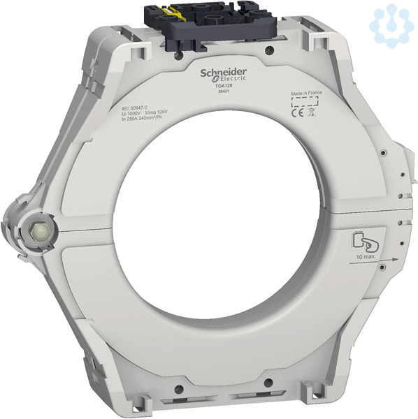 Dieser Ringkern ist für die Vigilohm Isolationsfehlersuchgeräte und die VigiPacT-Fehlerstromschutz- und Überwachungsrelais vom Typ A bestimmt. Es ermöglicht die Überwachung der eingespeisten Komponente von Vigilohm Insulation Monitor und die Messung eines Nennstroms bis zu 250A für VigiPacT-Überwachungs- und Schutzrelais. Das Übertragungsverhältnis beträgt 1/1000. Der Innendurchmesser des Toroids beträgt 120 Millimeter und das Gewicht 1,5 kg. Die Kabel müssen innerhalb des Toroids zentriert sein und der Durchmesser aller dieser Kabel sollte 60 mm nicht überschreiten. Der maximale Querschnitt pro Phase (R, S, T, N) beträgt 240mm² für einen Kupferleiter.