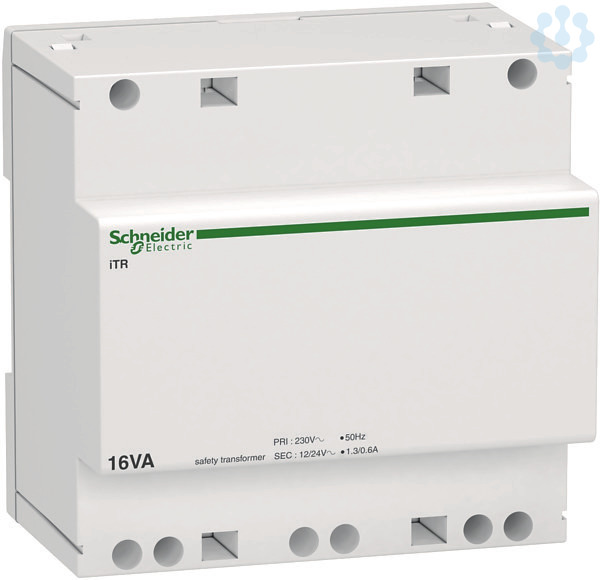 Sicherheitstransformator Acti 9 iTR. Ausgang 12-24V AC aus 230V Niederspannungsnetz, Leistung 16VA. Mit Klingel- und Sicherheitstransformatoren können Kleinspannungen aus einem Niederspannungsnetz entnommen werden. Kurzschlussfest. Schutzklasse II mit Klemmenabdeckung (optional). Galvanische Trennung zwischen Primär- und Sekundärspannung. Der Klingeltransformator iTR erfüllt folgende Normen- EN 61558-2-6 und EN 60742.