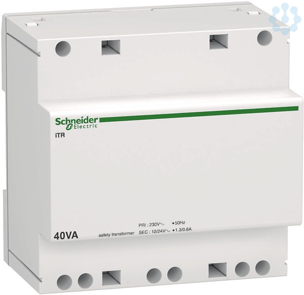 Sicherheitstransformator Acti 9 iTR. Ausgang 12-24V AC aus 230V Niederspannungsnetz, Leistung 40VA. Mit Klingel- und Sicherheitstransformatoren können Kleinspannungen aus einem Niederspannungsnetz entnommen werden. Kurzschlussfest. Schutzklasse II mit Klemmenabdeckung (optional). Galvanische Trennung zwischen Primär- und Sekundärspannung. Der Klingeltransformator iTR erfüllt folgende Normen- EN 61558-2-6 und EN 60742.