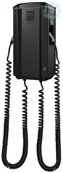 TWINBOX GTB+ Ladestation für Elektrofahrzeuge; Anschluss: (230)400V AC, 50Hz, (1)3-phasig; Anzahl der Ladepunkte: 2; fest angeschlossenes Spiralladekabel 4m; mit Ladekupplung Typ 2; Max. Leistung pro Ladepunkt: 11kW; Nennanschlussleistung: 22kW; BxHxT(mm): 377x660x213; Montageart: Wandmontage; Absicherung: ; FI Typ A + integr. DC-Fehlerstromerkennung (6mA); LS C 16A 4-polig; Autorisierung: RFID; Controller: CC612 Laderegler; Kommunikationsschnittstelle: LAN Modul mit Ethernet-Schnittstelle; Kommunikation: OCPP 1.6 JSON, Modbus TCP; Backendsystem: keine Vorkonfiguration; fest eingebauter, digitaler Modbus Energiezähler, MID-zertifiziert; Werkstoff des Gehäuses: Aluminium / schwarz; Schutzart (IP): IP44; Schlagfestigkeit: IK10; Umgebungslufttemperatur: -25°C bis +40°C; Standards: gem. EN 61851-1, IEC 61439-7