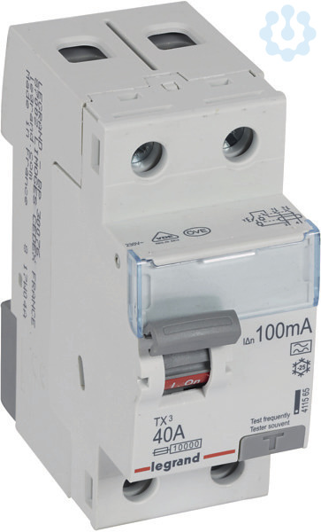 Legrand Fehlerstromschutzschalter TX3, Typ A, für Wechsel- und pulsierende Gleichfehlerströme nach VDE 0664-10, EN 61008-1, unverzögert, 2-polig, Bemessungsstrom In 40 A, Bemessungsfehlerstrom Idn 100 mA, Bemessungsspannung Un 230 VAC, Bemessungsfrequenz 50 Hz, Stoßstromfest bis 250 A, Bemessungskurzschlussstrom 10 kA bei geeigneter Vorsicherung, Befestigung auf Hutprofilschiene EN 60715 durch rastende Schnellbefestigungen, klare Information vorne auf jedem Gerät, eindeutige Schaltstellungsanzeige rot/grün am Schalthebel, mit Beschriftungsfenster, mit Untersteckschutz zum sicheren Einführen des Leiters in Fahrstuhlklemme, Anbau von Hilfsgeräten möglich.