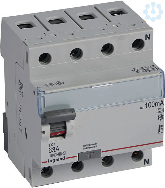 Legrand Fehlerstromschutzschalter TX3, Typ A, für Wechsel- und pulsierende Gleichfehlerströme nach VDE 0664-10, EN 61008-1, unverzögert, 4-polig, Bemessungsstrom In 63 A, Bemessungsfehlerstrom Idn 100 mA, Bemessungsspannung Un 400 VAC, Bemessungsfrequenz 50 Hz, Stoßstromfest bis 250 A, Bemessungskurzschlussstrom 10 kA bei geeigneter Vorsicherung, Befestigung auf Hutprofilschiene EN 60715 durch rastende Schnellbefestigungen, klare Information vorne auf jedem Gerät, eindeutige Schaltstellungsanzeige rot/grün am Schalthebel, mit Beschriftungsfenster, mit Untersteckschutz zum sicheren Einführen des Leiters in Fahrstuhlklemme, Anbau von Hilfsgeräten möglich.