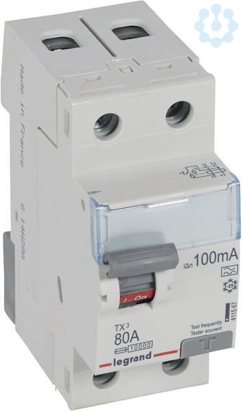 Legrand Fehlerstromschutzschalter TX3, Typ A, für Wechsel- und pulsierende Gleichfehlerströme nach VDE 0664-10, EN 61008-1, unverzögert, 2-polig, Bemessungsstrom In 80 A, Bemessungsfehlerstrom Idn 100 mA, Bemessungsspannung Un 230 VAC, Bemessungsfrequenz 50 Hz, Stoßstromfest bis 250 A, Bemessungskurzschlussstrom 10 kA bei geeigneter Vorsicherung, Befestigung auf Hutprofilschiene EN 60715 durch rastende Schnellbefestigungen, klare Information vorne auf jedem Gerät, eindeutige Schaltstellungsanzeige rot/grün am Schalthebel, mit Beschriftungsfenster, mit Untersteckschutz zum sicheren Einführen des Leiters in Fahrstuhlklemme, Anbau von Hilfsgeräten möglich.